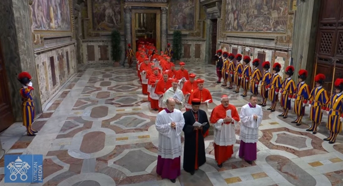 Các hồng y di chuyển từ Nhà nguyện Pauline tới Nhà nguyện Sistine ở Vatican để bầu giáo hoàng mới. Ảnh: Vatican News