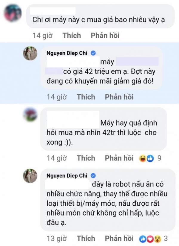 Dân mạng đã ngay lập tức hỏi Diệp Chi giá của thiết bị nấu ăn này, nữ MC tiết lộ nó có giá 42 triệu đồng. Trước cái giá khá đắt đỏ, cư dân mạng bày tỏ: "Máy hay quá, định hỏi mua mà nhìn 42 triệu thì luộc cho xong", "Thế nhưng máy này thì khác gì nồi hấp đâu nhỉ"...