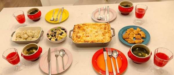 Cô từng đãi con gái và bạn của con bữa tối đầy màu sắc.Cùng với một khay Lasagna to bự là những loại bánh trái cùng salad hoa quả, canh rong biển đậu hũ...