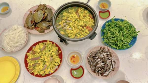 Chiếc nồi lẩu trông vô cùng "lãng mạn" cô làm với những bông hoa vàng xinh đẹp. Đi kèm là cua, cá linh, ngao, bún, rau đắng, nước chấm ăn kèm.