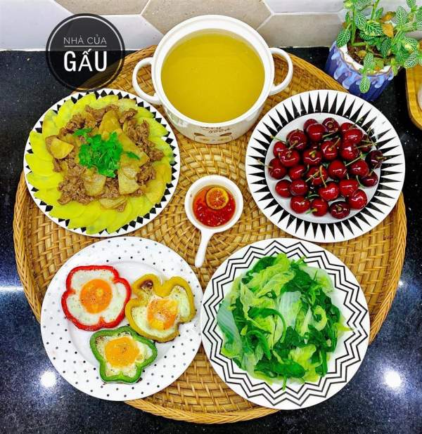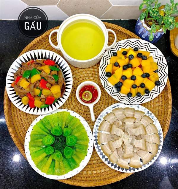 "Mình không đặc biệt thích một món nào cả, cứ mùa nào thức ấy để mua nguyên liệu thôi. Chủ yếu toàn món quen thuộc, do mình bày biện chụp hình nên cảm giác màu mè chứ toàn món bình dân gần gũi ý mà", mẹ bầu chia sẻ.