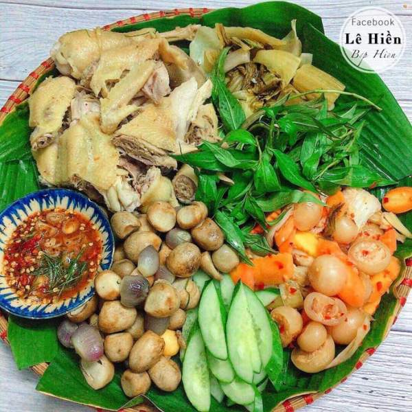 Bày gà ra mẹt, thêm rau răm - dưa cải chua - kim chi - nấm rơm - hành tím ăn kèm muối ớt.