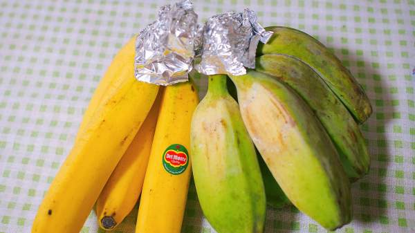 Để chuối chín lâu bị hỏng và không bị đốm đen, chị Hoa bọc giấy bạc quanh cuống.
