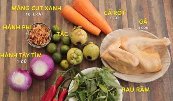 1 con gà, 25 gram rau răm, 1 củ cà rốt, 10 trái măng cụt xanh, 25 gram hành phi, 1 củ hành tây tím, 100 gram Tắc (quả quất, quả hạnh), 2 trái ớt