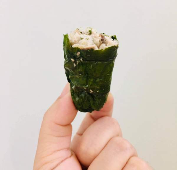 - Cuốn chả: gập 2 mép lá lốt lại, cho 1 thìa thịt vào giữa cuộn từ phần cuống lên trên.