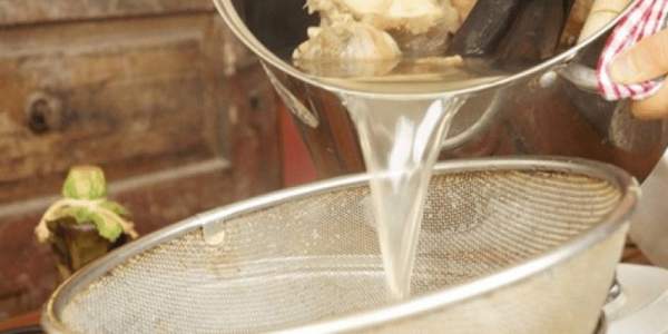 Nếu bạn ninh xương gà bị đục, có thể cho tiếp xương gà vào đun thêm để nước xương trong hơn. Trước khi dùng, lọc nước xương qua rây mắt nhỏ hoặc vải lọc để lấy phần nước dùng trong.