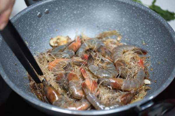 Bước 2: Cho tôm, mì và tất cả nước sốt vào chảo, xếp tôm lên trên.