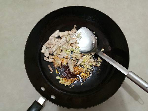 Phi thơm hành tỏi, cho thịt heo vào xào chín rồi thêm các nguyên liệu còn lại vào, đảo đều.