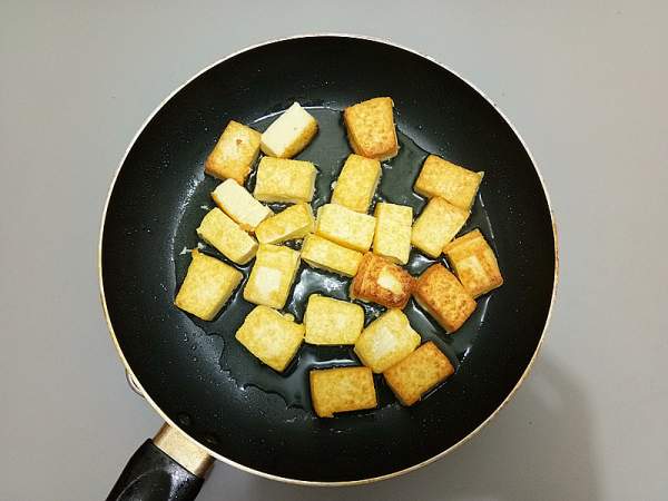 Đậu phụ cắt miếng vừa ăn rồi cho vào chảo chiên vàng 2 mặt. Nếu không, bạn có thể mua loại đậu phụ chiên sẵn.