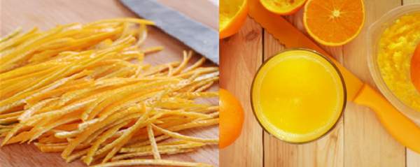 Cam dùng vắt lấy nước và giữ lại phần vỏ. Nước cam pha cùng đường hoặc mật ong, còn trong trường hợp cam bạn sử dụng là cam ngọt thì nên cho một chút chanh vào, nêm thêm gia vị theo sở thích của bạn hay gia đình là được. Phần vỏ cam đã giữ lại thì thái sợi và luộc cho ra hết dầu đắng, nếm thử vỏ cam hết đắng hoặc hơi có vị đắng là chuẩn vị. Sau khi vỏ cam đã hết đắng, bạn hãy xào vỏ cam lên cho đến khi săn lại. ( Tuy nhiên bạn cũng có thể bỏ qua bước này).