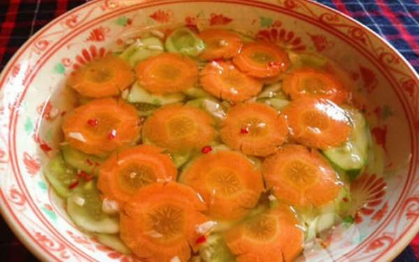- Bào vỏ cà rốt và đu đủ rồi ngâm vào nước muối pha loãng. Bào cà rốt và đu đủ thành lát mỏng, sau đó vớt bỏ nước ngâm đi. Tiếp đến cho đường, giấm, bột canh, chanh và ớt vào trộn đều. Nếm có vị chua ngọt là được.