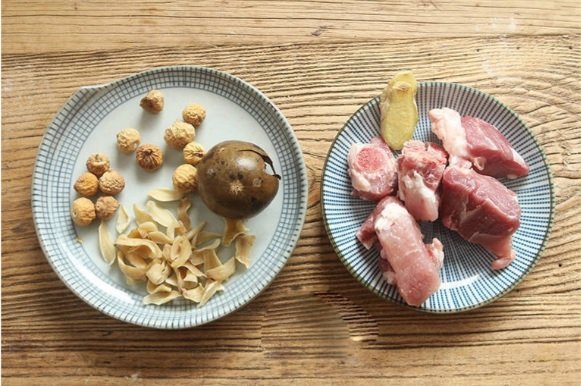 - Bóp quả la hán, cho cùng sung khô và củ bách hợp khô thái lát vào nồi. Thêm xương sườn đã rửa sạch. Bỏ vào 3 lát gừng tươi để khử mùi và tạo độ thơm.