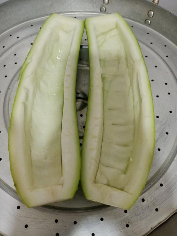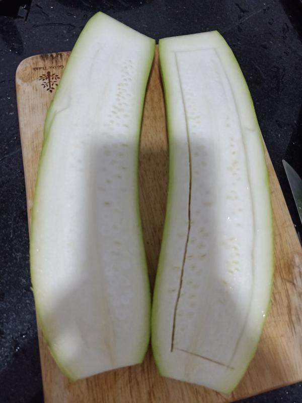 - Chẻ đôi dùng dao rạch 4 đường xung quanh miếng bầu lấy ruột ra.