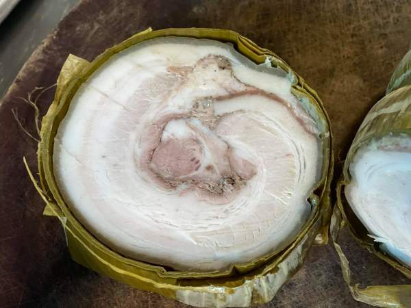 Giò nây được làm từ thịt ba chỉ nguyên tảng, không xay nhuyễn như các loại giò khác mà phải giữ lại lớp mỡ và bì giòn. Ảnh: Oanh Lượng.