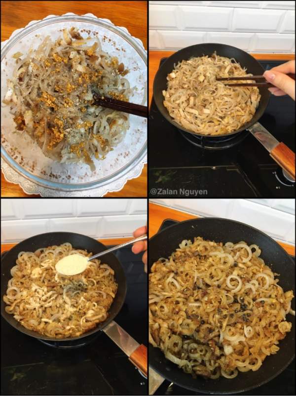 Thính được làm từ ba loại nguyên liệu là gạo tẻ, gạo nếp và đậu xanh rang vàng nên có mùi thơm. Tiếp theo, trộn bì và thịt khìa, nêm gia vị cho vừa ăn. Sau cùng, rắc thính và một ít tiêu là xong.