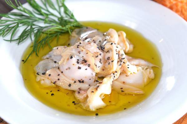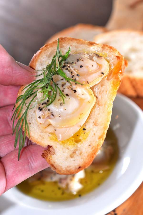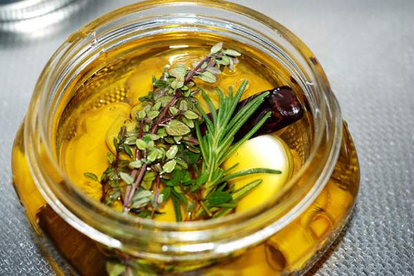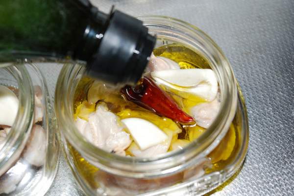 Cho tỏi, ớt vào, thêm nghêu, hương thảo, cỏ xạ hương, đổ ngập dầu ô liu rồi đậy nắp, để trong tủ lạnh 1-2 ngày là được. Món này có thể bảo quản trong tủ lạnh được 1 tuần.