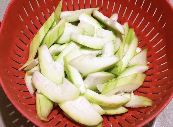 -Chẻ dọc bầu làm đôi sau đó cắt miếng nhỏ vừa ăn (có thể giữ lại hoặc cắt bỏ bớt phần ruột tùy thích).