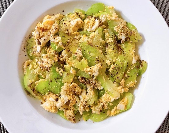 - Múc bầu xào trứng ra đĩa, rắc thêm ít tiêu xay cho món xào thêm dậy mùi thơm là hoàn thành.