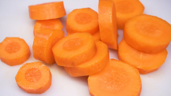 -Cà rốt gọt vỏ, cắt thành từng khoanh lớn. Tỏi cắt bỏ phần trên để lộ tép. Gừng gọt vỏ, cắt thành từng lát dày.