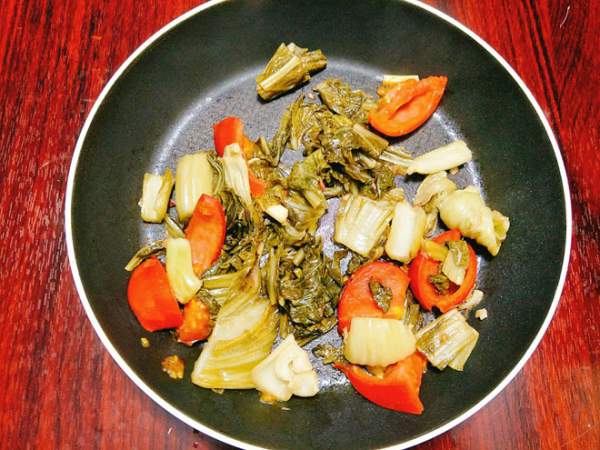 - Đặt chảo lên bếp, đun nóng 1 thìa dầu ăn rồi cho hành vào phi thơm. Tiếp theo, cho cà chua vào xào cho chín mềm, thêm dưa chua vào xào cùng. Nêm chút bột nêm, bột canh cho vừa khẩu vị, đảo một lúc thì thêm dứa vào xào cùng trong 1-2 phút.