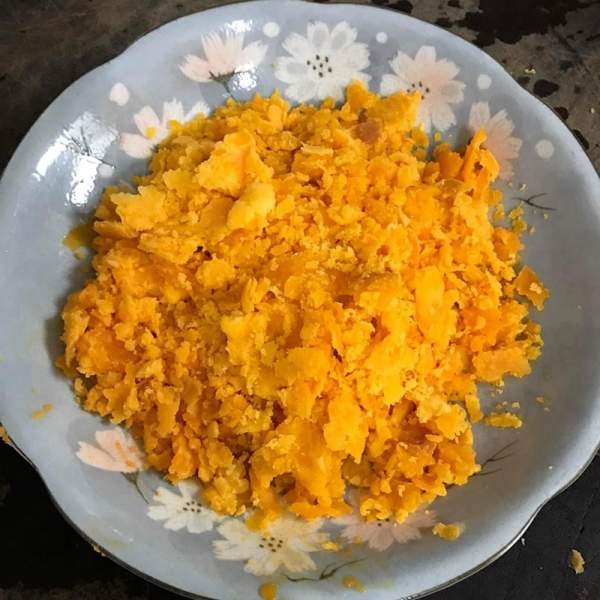 - Cho 2 lòng đỏ trứng muối vào tô, thêm 1/3 muỗng canh bơ, xíu hạt nêm rồi đánh tan lòng đỏ cho mịn sau đó đem hấp chín.