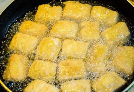 - Lăn lần lượt từng miếng đậu phụ qua bột chiên giòn sao cho bột phủ đều các bề mặt đậu phụ.