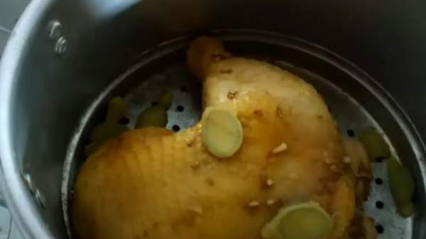 -Xếp gừng và hành tây xuống đáy xửng, đặt gà vào rồi hấp khoảng 30-35 phút. Lấy gà ra, chờ nguội thì chặt miếng vừa ăn.