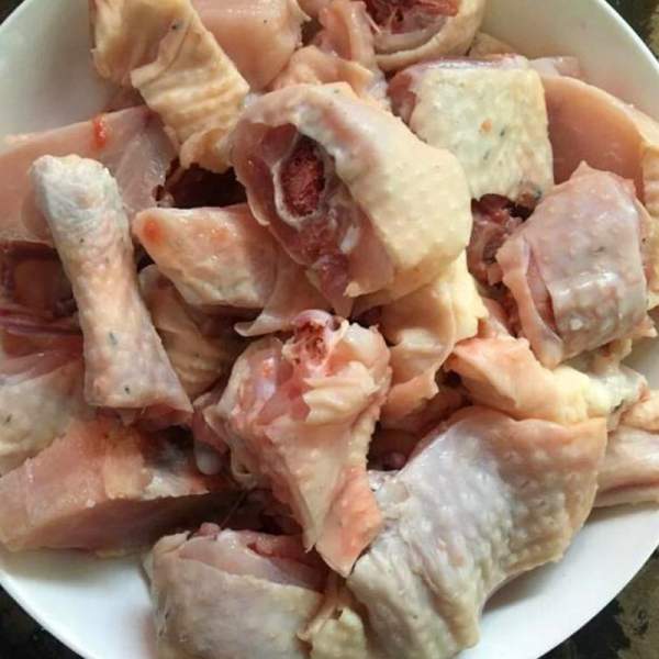 - Đùi gà rửa sạch. Để khử mùi hôi bạn dùng một ít muối hạt chà xát lên bề mặt miếng gà sau đó rửa lại với nước sạch, để ráo rồi chặt miếng vừa ăn.