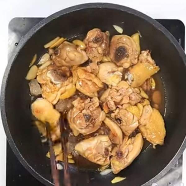 - Đun ở lửa vừa cho thịt gà chín và ngấm gia vị từ nước xốt. Để thịt gà có màu bắt mắt, bạn cho thêm hắc xì dầu vào đảo đều rồi đậy nắp lại, đun trong khoảng 3 phút.