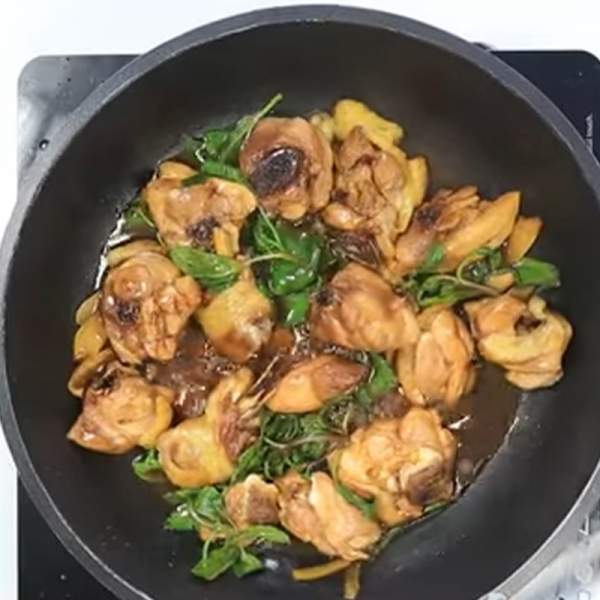- Khi thịt đã chín mềm và thấm vị, bạn mở nắp chảo ra, cho húng quế vào đảo cùng với thịt gà rồi tắt bếp.