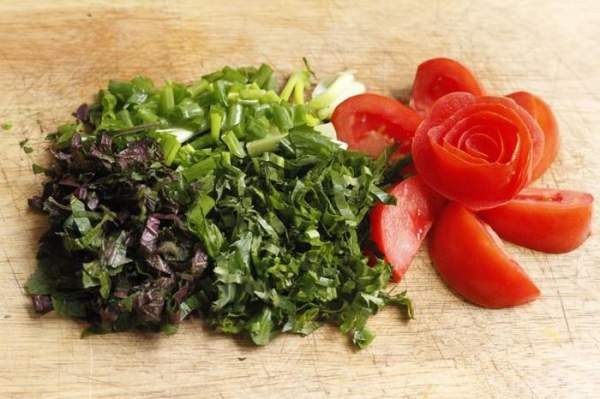- Tía tô, lá lốt, rau xà lách nhặt và rửa sạch, thái nhỏ. Hành khô băm nhỏ. Cà chua bổ múi cau.