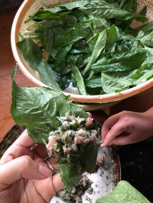 - Phần thịt lợn xay trộn thêm bột nêm, hạt tiêu, chút hành khô băm nhỏ và lá xương sông thái nhỏ ướp khoảng 20 phút. Lấy lá xương sông để gói phần thịt thành những viên nhỏ sao cho toàn bộ phần lá sẽ bọc được hết thịt thì lúc ninh viên chả mới không bị vỡ. Có thể dùng dây lạt tre mỏng, sợi dứa, lá hành hoặc cây tăm xiên vào để buộc chặt lá xương sông.