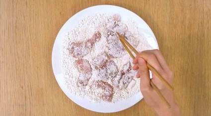- Thịt lợn rửa sạch với nước muối loãng, để ráo. Dùng dao thái thịt thành các lát mỏng và ướp trong 20 phút với dầu mè, rượu trắng, hạt tiêu, đường, tinh bột ngô, nước tương với định lượng như trên. Hết thời gian ướp, lăn từng miếng thịt qua một lớp bột khoai lang.