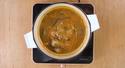- Đun sôi một nồi nước, cho thịt lợn vào nấu khoảng 4 phút, vớt ra để riêng. Tiếp theo, cho cà rốt, mộc nhĩ, nấm hương, nấm kim châm vào đun trong khoảng 5 phút, để lửa vừa.