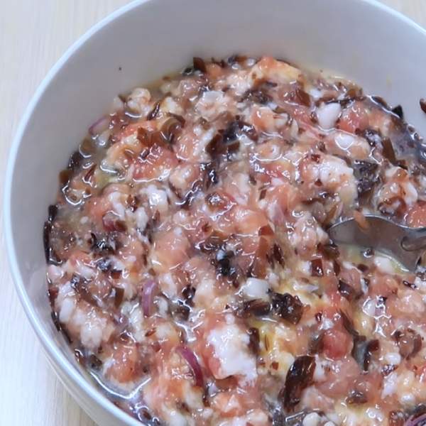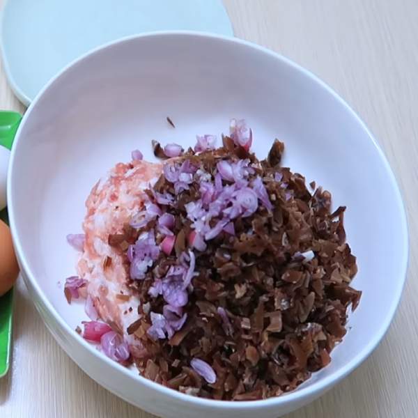 Tiếp theo, bạn cho vào bát: 400gr thịt băm cùng hành tím, mộc nhĩ đã được băm nhuyễn, 4 lòng trắng trứng, 2 lòng đỏ trứng, 1 muỗng cà phê nước mắm, 2 muỗng cà phê muối, 2 muỗng cà phê đường, 1 muỗng cà phê hạt nêm, 1/3 muỗng cà phê hạt tiêu xay. Sau đó trộn đều hỗn hợp.
