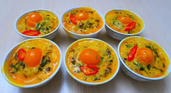 Bạn chuẩn bị vài chiếc bát nhỏ, quét 1 lớp dầu ăn hoặc dầu mè vào lòng bát để thịt không bị dính sau khi hấp. Sau đó, bạn múc hỗn hợp thịt đã trộn vào bát, đặt 1 hoặc 1/2 lòng đỏ trứng muối lên trên cùng chút hành lá và vài lát ớt đã cắt.