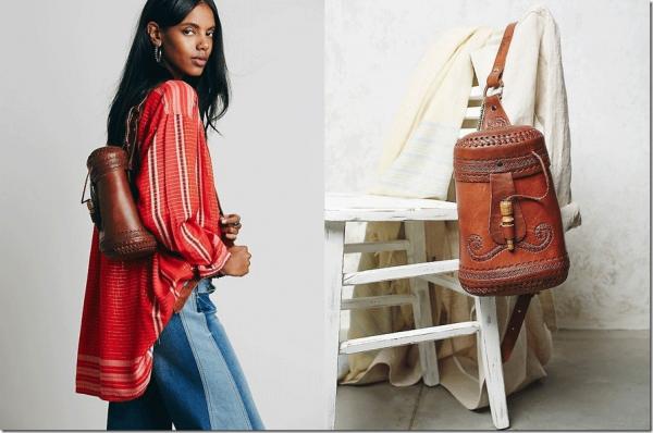 Chiếc túi này có thiết kế đặc biệt với dạng hình trụ. Với những họa tiết cầu kỳ trên chất liệu gỗ và dây đeo da có thể tùy chỉnh độ dài. Chiếc túi boho này là phụ kiện khá sang trọng cho set đồ của bạn.