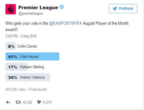 Trong khi đó, HLV Jose Mourinho (53 tuổi) của Man United nhận giải HLV xuất sắc nhất tháng Tám của Premier League. Nhà cầm quân người Bồ Đào Nha đã nhận được 40% phiếu bầu. Trong khi đó, HLV Antonio Conte của Chelsea đứng thứ 2 với 33% phiếu bầu. HLV Pep Guardiola của Man City chỉ được 14% người bầu chọn.