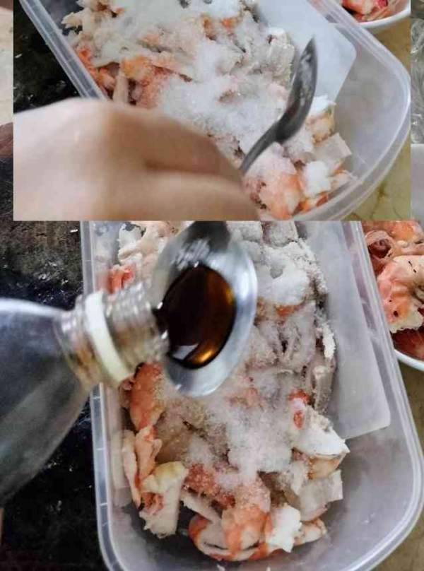 Đập nhánh tỏi, vắt vài giọt nước cốt chanh và cắt thêm vài lát ớt vào cho đẹp mắt và trộn tiếp cho tôm, thịt ngấm mắm muối gia vị. Có thể đậy nắp hộp, hoặc bịt kín cất vào ngăn mát tủ lạnh.