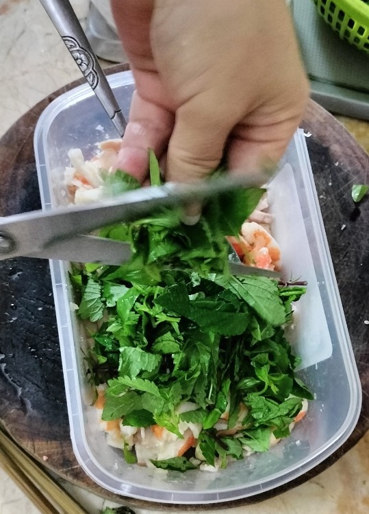 Trước khi ăn món gỏi bưởi tôm thịt hãy cắt rau gia vị vào cho tươi ngon. Ảnh H.D