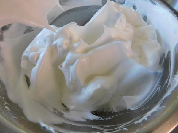 Bước 3: Cho nước cốt chanh vào lòng trắng dùng máy đánh bông khoảng 1 phút ở tốc độ trung bình. Sau đó cho 1/2 đường vào tăng tốc độ đánh 40 giây, cuối cùng cho số đường còn lại vào đánh thêm 90 giây là lòng trắng sẽ bông cứng, nhấc lên sẽ có chóp.