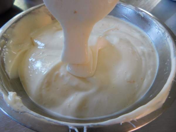 Bước 4: Cho 1/2 lòng trắng vào âu lòng đỏ, dùng phới lồng trọn nhẹ-đều trước khi cho tiếp phần lòng trắng còn lại vào trộn chung. Đổ hỗn hợp này vào các khuôn nhôm hay khuôn nào bạn có. Xếp khuôn lên khay, thả nhẹ khay bánh lên bàn để bột thoát khí.