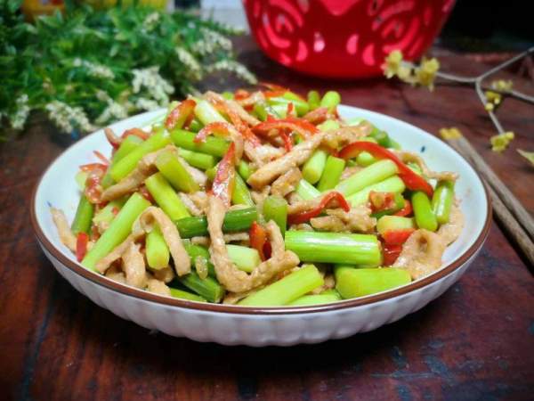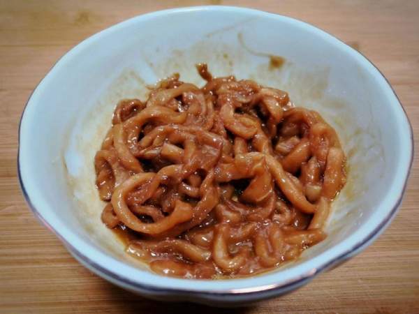 Thịt nạc rửa sạch, thái thành sợi nhỏ như ngón tay út hoặc to hơn đầu đũa một chút, dài 5cm. Cho thịt vào bát, nêm chút muối, nước tương, dầu hào, 1 thìa bột bắp, trộn đều. Cuối cùng thêm chút xíu đường, dầu ăn, dùng tay trộn đều, rồi để riêng ướp 10 phút cho thịt thấm gia vị từ từ.