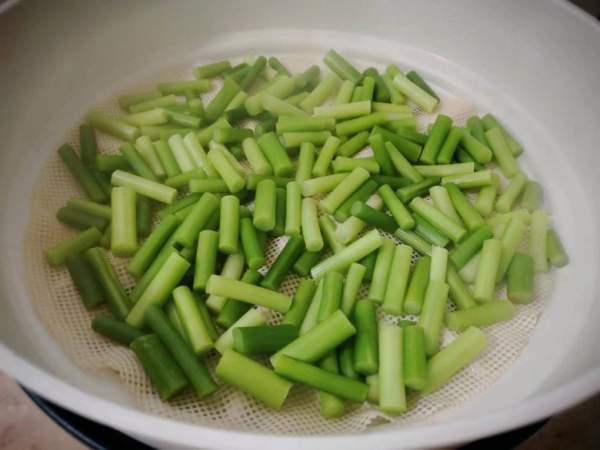 Sau khi ngâm xong ngồng tỏi, vớt ra. Cho ngồng tỏi vào nồi hấp 2 phút sau khi nước sôi để ngồng tỏi có màu xanh và hương vị thơm hơn mà giá trị dinh dưỡng sẽ không bị mất đi nhiều.