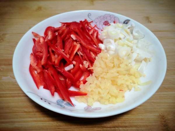 Chuẩn bị một quả ớt sừng hoặc ớt ngọt rửa sạch, dùng dao loại bỏ hạt. Sau đó thái ớt thành sợi mỏng. Dùng dao đập một miếng gừng nhỏ rồi băm nhuyễn. Đầu trắng hành lá thái nhỏ.