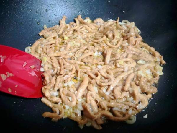 Làm nóng chảo, cho dầu ăn vào, khi dầu nóng 70% thì cho hành lá và gừng băm nhuyễn vào xào thơm. Sau đó cho thịt lợn thái đã ướp vào và đảo đều, xào đến khi miếng thịt đổi màu, cho ra đĩa.