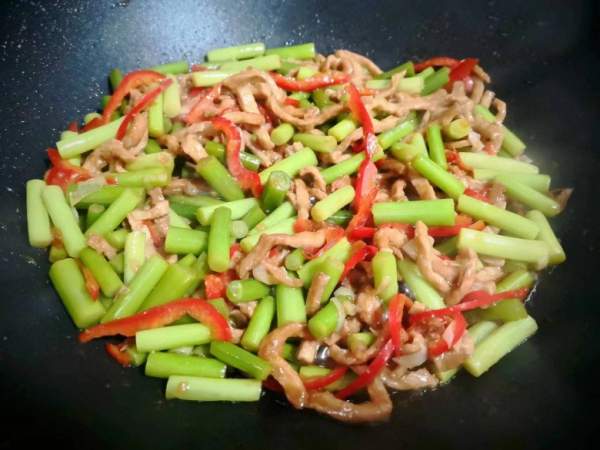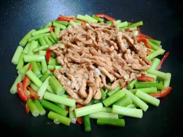Để lại phần dầu dưới đáy chảo, cho ớt đỏ vào xào khoảng nửa phút, sau đó cho ngồng tỏi vào xào khoảng 1 phút, rồi cho thịt lợn đã chiên vào, tiếp tục đảo đều.
