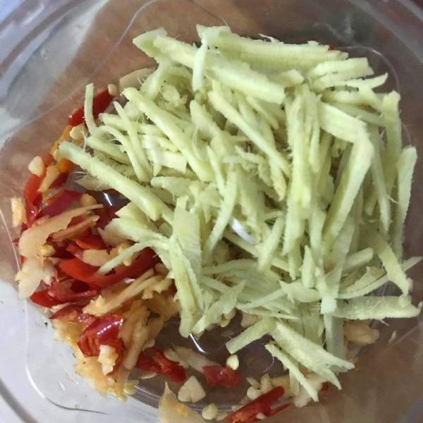 Gừng bạn cạo vỏ, rửa sạch rồi cắt sợi mỏng vừa ăn, dài khoảng 2 lóng tay.