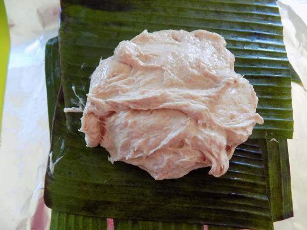 - Trải 1 miếng giấy bạc to. Bên trên xếp vài miếng lá chuối, cho giò sống vào. Lượng giò nhiều hay ít tùy thuộc vào độ lớn của lá và giấy bạc.