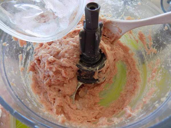 - Sau 1 tiếng, cho thịt và tất cả các gia vị phía trên cùng tinh bột bắp, (ngoại trừ đá lạnh) cho vào máy xay 1 phút. Sau đó cho hết nước đá lạnh vào tiếp tục xay 1 phút 30 giây.